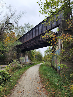 The 148.8 mile GAP Trail runs from Cumberland to Pittsburgh along the old Western Maryland and Pittsburgh & Lake Erie railroads. Other than the Historic operations between Cumberland and Frostburg, the line was completely abandoned by 1985 with the closure of the P&LE routes. For the vast bulk of the trail, over 120 miles is covered with "crushed quartz" AKA 'the grit'. This grit becomes cementlike when it gets wet and later dries. Being a porous surface, rain water quickly dissipates. Unless it's stuck to you or your bike. The eastern half is red grit; the western half is light gray with the divide between the two near Ohiopyle.